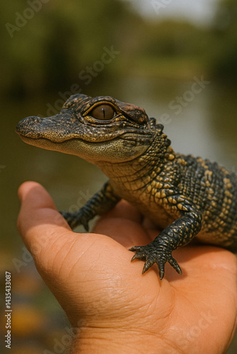 A tiny baby alligator resting calmly in one hand, its rough, scaly skin glistening under natural sunlight, with a blurred swamp or riverbank background
