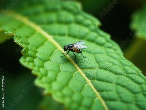 A tiny fly hovering around a delicate green leaf with intricate veins and small ridges, aerial view, nature scene, outdoor landscape
