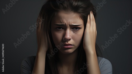 a tired, exhausted teen girl holding her temple in pain against a grey background, the concept of headache, migraine, cephalalgia, hypertension, and premenstrual syndrome.