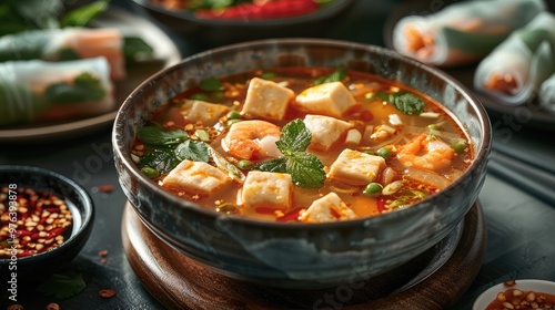 A tom yum soup, summer rolls. Generative AI.
