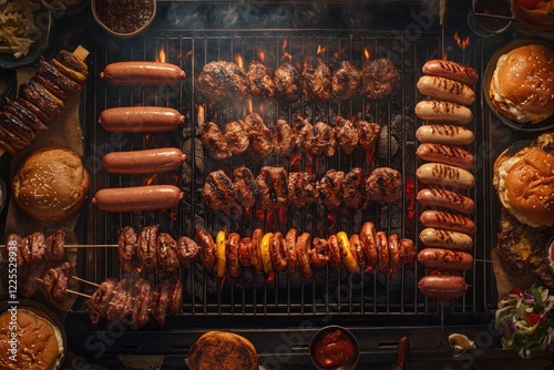 A top - down view of a grill filled with burgers, hot dogs, and skewered meats
