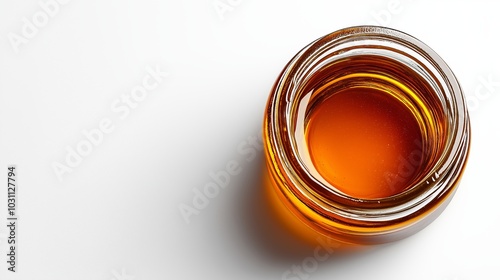 A top-down view of a glass jar filled with amber honey against a clean, white background, offering ample space for text