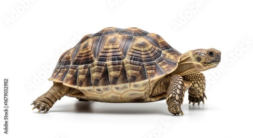 A tortoise stands on a white surface its patterned shell prominent and detailed showcasing its textured skin and claws