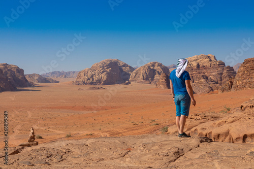 A tourist standing by the look out of a panoramic view of the desert in Wadi Rum, Jordan, Middle East.