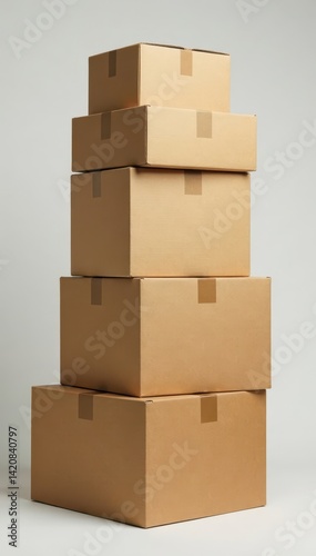 A towering stack of used cardboard boxes ready for recycling , light, dented