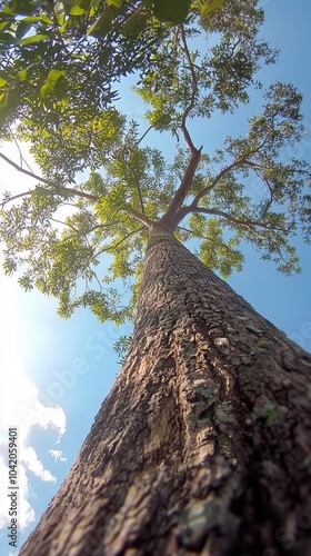 tree, nature, sky, sunlight, leaf, bark, outdoors, growth, green, calmness, perspective, scenery, blue, environment, foliage, weather, day, branch, forest, landscape, summer, plant, ecosystem, beauty, fresh air, wild, vibrant, flora, serenity, tall, majestic, rural, peaceful, winding, root, canopy, shade, natural, cloud, diverse, altitude, motion, harmony, wood, ecology