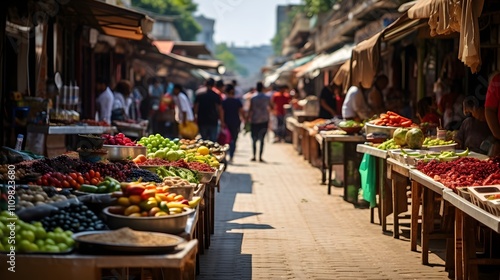 A traditional Chinese market featuring wooden stalls filled with fresh vegetables and fruits. Red lanterns hang above, and the street is lined with classical Chinese architectural elements.