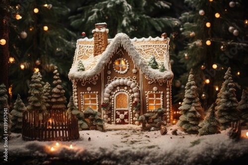 A traditional Christmas-decorated gingerbread house christmas cookie christmas lights.