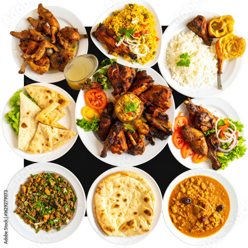 a traditional Eid meal with grilled meat, naan, salad, and drinks, arranged neatly isolated on white and transparent background.