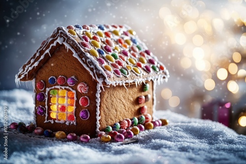 A traditional gingerbread house sitting on top of snow-covered ground, perfect for winter scenes or holiday decorations