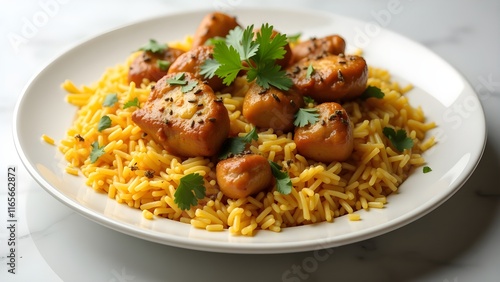 A traditional Indian biryani dish with fragrant basmati rice, saffron, and marinated chicken