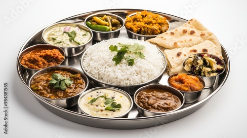 A traditional Indian thali with a variety of dishes including curry, dal, rice, naan, and pickles, arranged on a stainless steel tray against a clean white background.