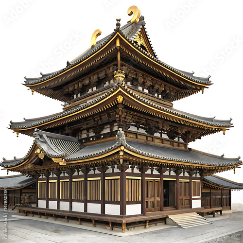 A traditional Japanese pagoda with intricate wooden details, tiered rooftops, and red accents isolated on transparent background. Png