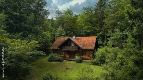 A traditional log chalet in a serene forest, offering a secluded and cozy escape into nature.