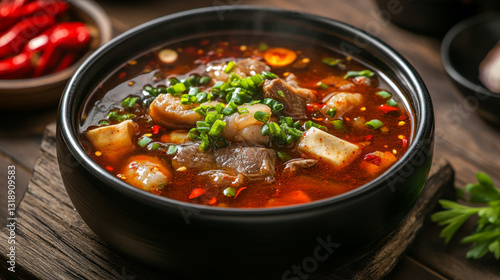 A traditional soup made by simmering meticulously cleaned beef, chicken, or fish intestines with seasonings like red pepper paste, soy sauce, garlic, and ginger