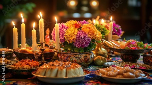 A traditional table setup with symbolic birthday items: candles, flowers, and an array of handcrafted cultural dishes