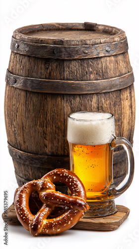 A traditional wooden beer barrel with a glass of beer and a golden pretzel placed next to it, isolated on a white background.