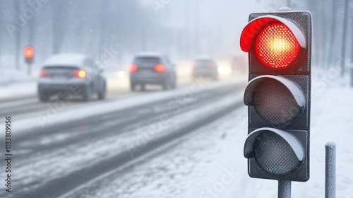 traffic, light, red, winter, snow, hurry, navigation, movement, motor, emergency, driving, vehicle, infrastructure, fog, weather, safety, signal, journey, rule, car, scenery, control, transportation, scene, commute, regulation, ice, stop, alert, condition, caution, visibility, pedestrian, brake, winter storm, delay, asphalt, urban, design, roadwork, stoplight, road, nature, environment, season, travel, cold, landscape