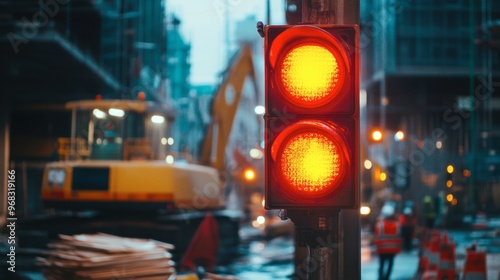 A traffic light showing red at a construction site, with workers and machinery in the background.