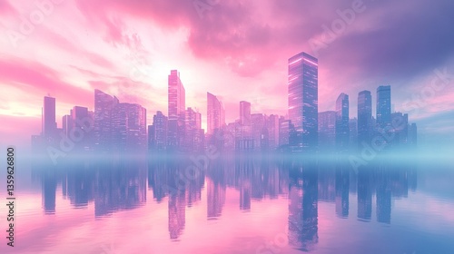 A tranquil city skyline with glass towers glowing in pastel sunset tones, their reflections shimmering softly on the water below, the scene framed by the fading light of dusk