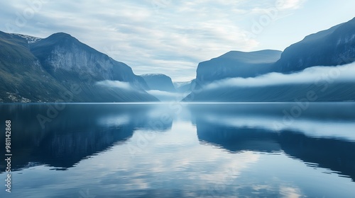 A tranquil fjord surrounded by towering mountains and soft clouds, reflecting perfectly on the calm water surface