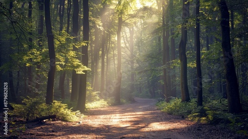 A tranquil forest scene, a path winding through tall trees, sunlight filtering through