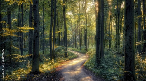 A tranquil forest with a winding path leading through tall trees, with sunlight filtering through the leaves.