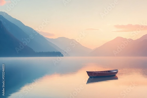 A tranquil lake surrounded by tall mountains, with a small wooden boat drifting peacefully in the water at sunrise.