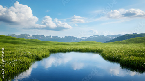 A tranquil landscape featuring vibrant green grass, a calm reflective pond, and majestic mountains under a clear blue sky. An ideal scene for nature lovers and outdoor enthusiasts.