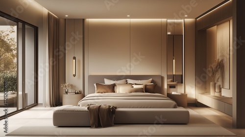 A tranquil modern bedroom with a neutral color palette, sleek furniture, and a large, cozy bed framed by warm-toned lighting and minimalist decor.