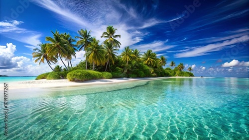 tropical, island, palm tree, beach, white sand, turquoise water, blue skies, cloud, ocean, paradise, nature, vacation, tropical paradise, pristine, idylli, scenic, get-away, serenity, tranquil, peaceful, relax, escape, tropical island