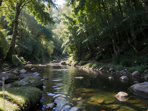 river, forest, tree, water, nature, landscape, stream, sunlight, wood, green, rock, foliage, outdoors, environment, scenic, tranquil, peaceful, flowing, cascade, vegetation, leaf, branch, shadow, moss, bank, shore, stone, timberland, wilderness, path, journey, adventure, exploration, destination, tour tourism, vacation, travel, relaxation, quiet, serenity, calm, beauty, natural, ecosystem, conservation, preservation, earth