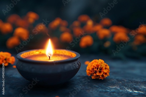 A tranquil scene featuring a lit candle beside vibrant marigold flowers, evoking warmth and serenity in a peaceful setting.