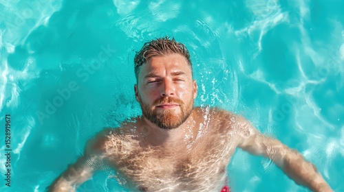 A tranquil scene featuring a man floating peacefully in a clear blue pool, exuding relaxation and contentment under the warm sunlight and sparkling water surface.