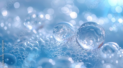 A tranquil scene of air bubbles resting on a liquid surface, bathed in blue light
