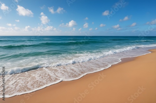 A tranquil shot of a pristine beach with turquoise waves gently lapping the golden sand under a bright blue sky with scattered clouds.