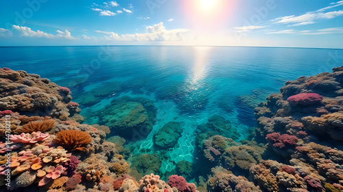 coral reef, underwater, ocean, sea, tropical, island, paradise, turquoise water, blue skies, clearwater, vibrant, colourful, marine life, coral, fish, snorkeling, diving, scuba diving, nature, landscape, seascape, travel, vacation, holiday, exotic, beautiful, stunning, tranquil, serene, calm, peaceful, biodiversity, conservation, underwater photography, digital artwork