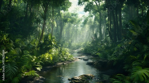 jungle, forest, stream, river, water, green, leaf, sunlight, tree, foliage, tropical, nature, rainforest, path, mossy, rock, vibrant, lush, scenic, serenity, peace, calmness, wild, adventure, escape, beauty, wilderness, outdoors, travel, exploration, photo, background, wallpaper, illustration, art