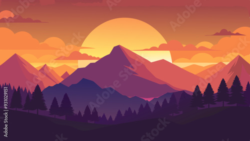 A tranquil summer sunset over a mountain silhouette vector art illustration