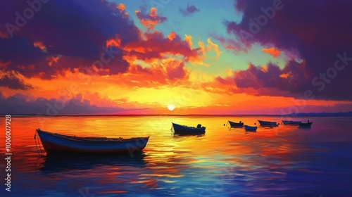 A tranquil sunset over a beach dotted with small fishing boats, their outlines silhouetted against the colorful sky and calm waters.