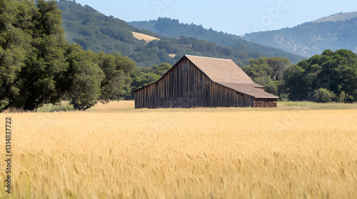 tranquil, wheat, field, wooden, barn, distance, gold, summer, rural, landscape, nature, scenic, peaceful, agriculture, huge, horizon, sunlight, rustic, countryside, harvest, open, bright, warm, nostalgic, traditional