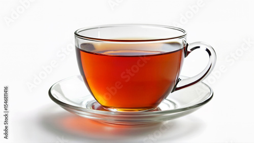 A transparent glass cup with hot aromatic tea sits on a matching saucer, isolated on a white background. The image is suitable for illustrating beverage concepts, tea advertisements, or menu designs.