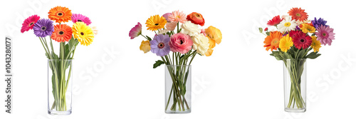 A transparent glass vase filled with fresh flowers isolated on transparent background