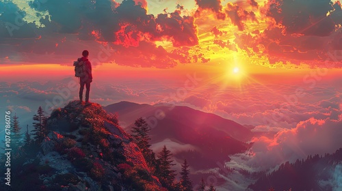 A traveler exploring a scenic mountain landscape, backpack on, looking out over the horizon, adventure and freedom, vibrant natural colors and sunlight