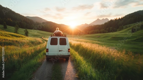 A traveler sits atop a vintage van amidst lush fields and rolling hills, gazing at a breathtaking sunset, embracing the peace and beauty of nature during their journey.