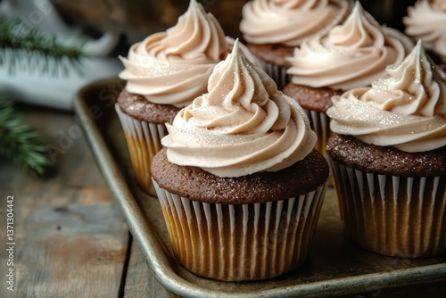 A tray of cupcakes with piped frosting swirls and edible glitter accents, placed on a rustic table