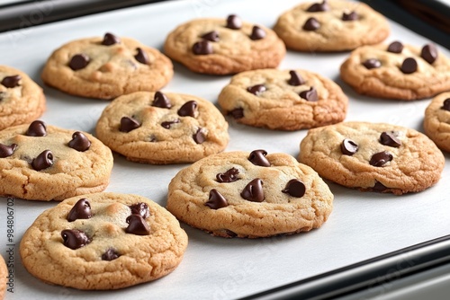 A tray of freshly baked cookies, warm from the oven and oozing with melted chocolate chips