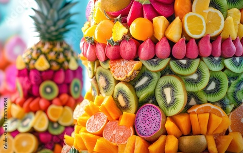 A tree made of vibrant tropical fruits like kiwi dragon fruit and pineapple slices stacked in a colorful display