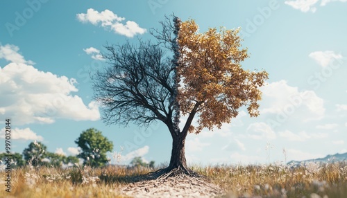 A tree outdoors depicted as half alive and half dead, symbolizing environmental change and global warming.