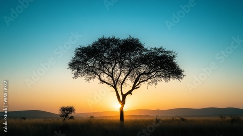 A tree silhouetted against a blue sky at dawn, with the sun rising behind it.